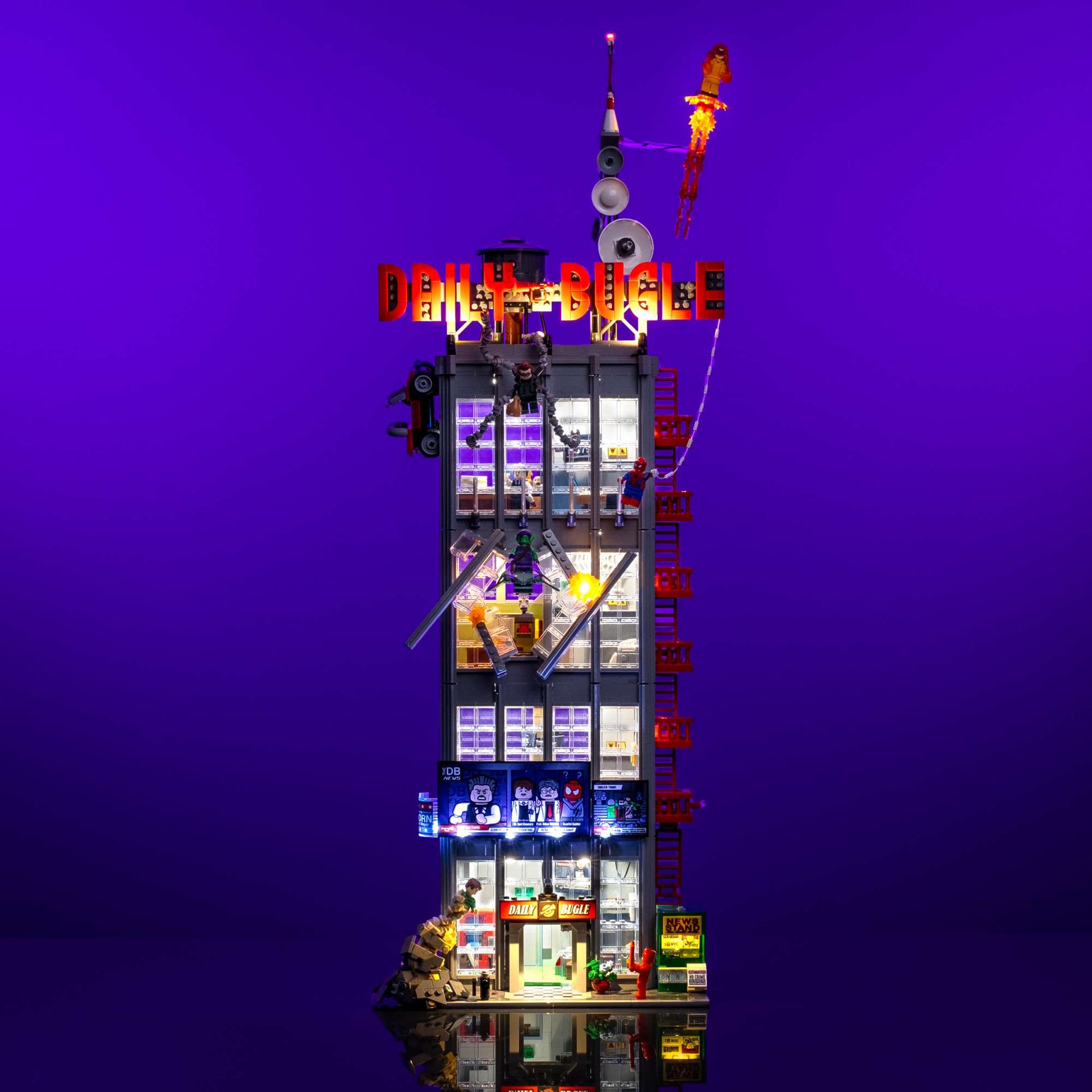There’s nowhere to hide with the Light My Bricks™ custom light kit for the LEGO® Daily Bugle! Featuring 7 bright white meteor lights for the interior, dynamic flicker effects for explosive scenes, and cool spotlighting across the exterior. Our kit includes the iconic Bugle sign and News Stand and brings every superhero moment to life. With wireless flux touch plates between levels and cinematic lighting throughout, it’s the ultimate centrepiece upgrade for your Marvel display.