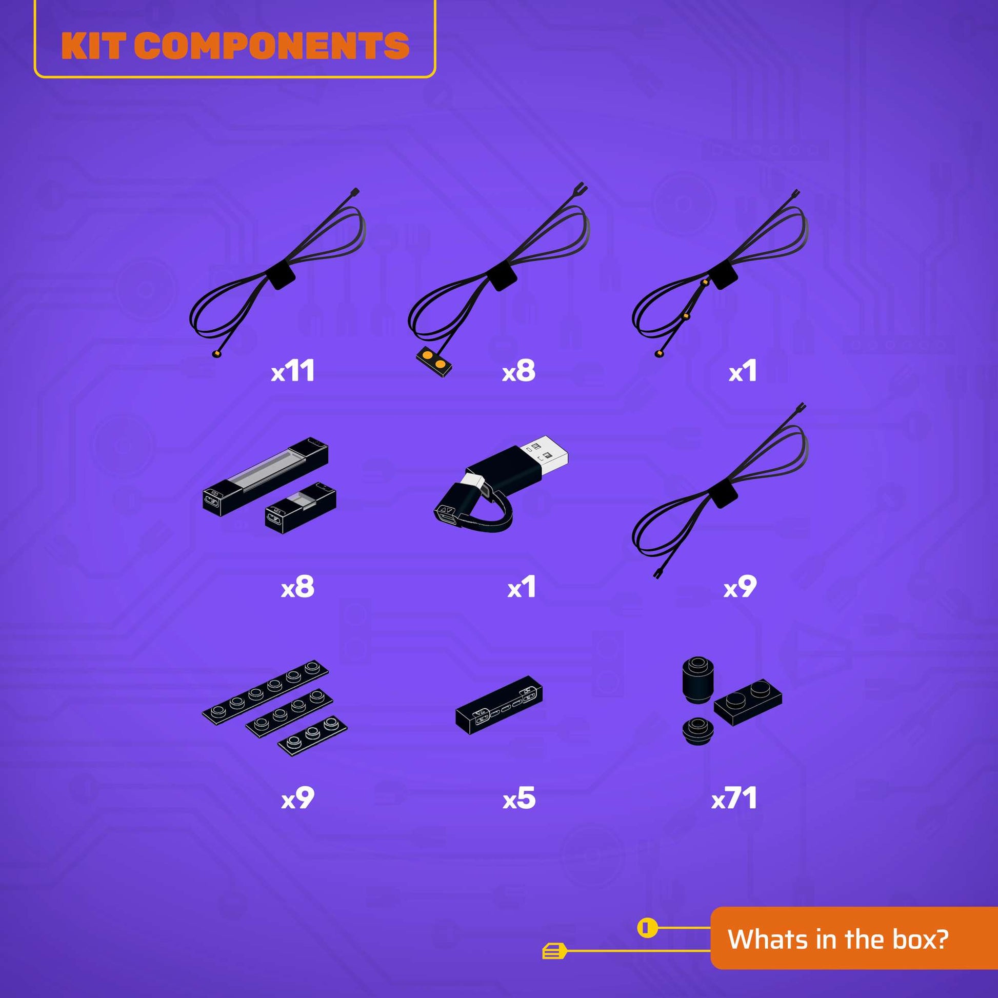 - All component casing and housing has been designed to connect seamlessly onto the LEGO stud system, with LEGO dimensional parts.